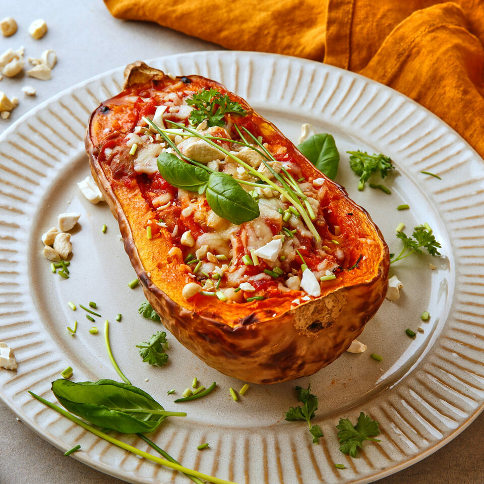 Dieser gratinierte Butternut-Kürbis beweist, wie lecker ein veganes Hauptgericht sein kann. Mit seiner Füllung aus Pilzen, Tofu, Kürbis und Tomatensauce überzeugt der überbackene Kürbis auf ganzer Linie.