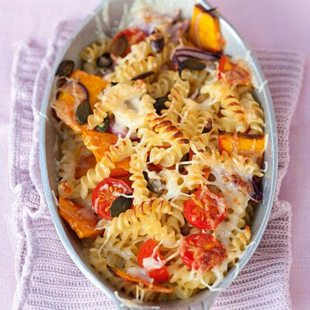 Die besondere Raffinesse erhält der Auflauf durch geröstete Kürbiskerne und würzige Kräuter.