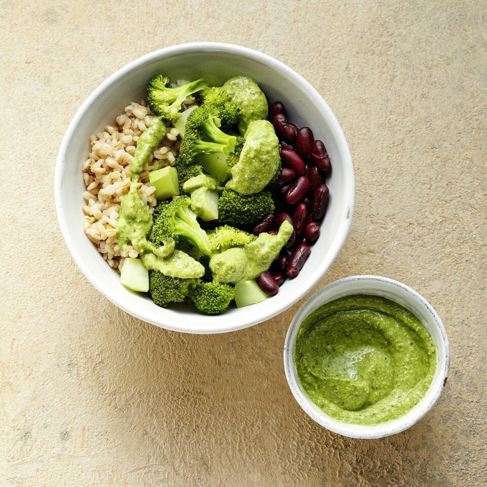 Zum Servieren die Kidneybohnen in einem Sieb abbrausen und abtropfen lassen. Die Graupen mit Brokkoli und Bohnen auf Schalen (Bowls) verteilen und mit reichlich Dressing servieren. Das reichhaltige Dressing passt auch zu Blattsalaten und eignet sich als Brotaufstrich.