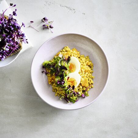 Den Risotto mit der Salsa toppen und die Eihälften darauf verteilen.