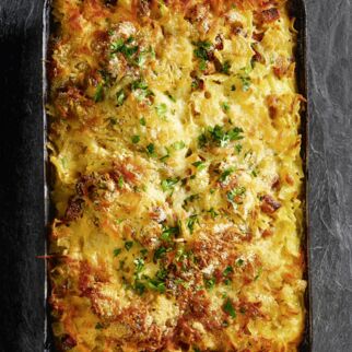 Österreichische Kartoffelpfanne mit Nudeln und Wurst - perfekt für kalte Tage.