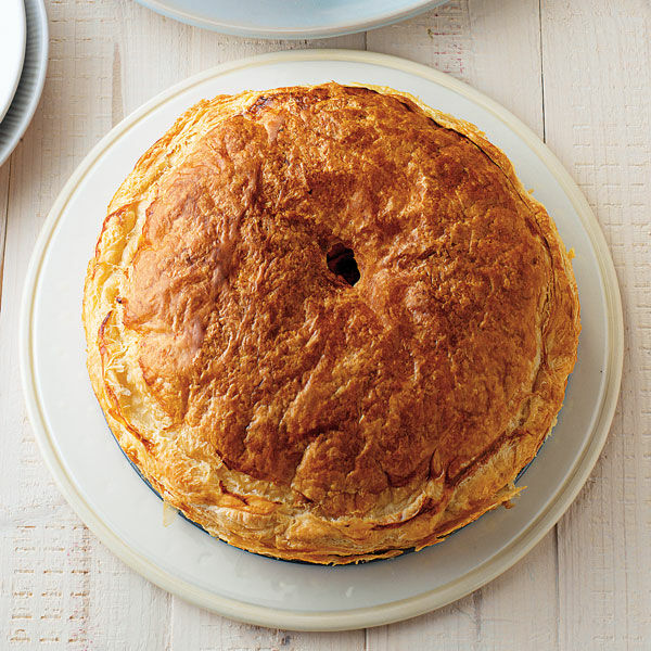 Ofen auf 190° vorheizen. Ränder von ⅔ der Teigplatten mit Wasser bepinseln und die Platten überlappend ausrollen. Die Form damit auskleiden, den Rand 3 cm hochziehen und oben mit Eigelb bepinseln. Gemüse einfüllen und mit restlichem Teig bedecken, dabei die Ränder fest drücken. In die Mitte ein kleines Loch schneiden. Die Pastete mit Eigelb bepinseln. Im Ofen (unten, Umluft 170°) 1 Std. backen.