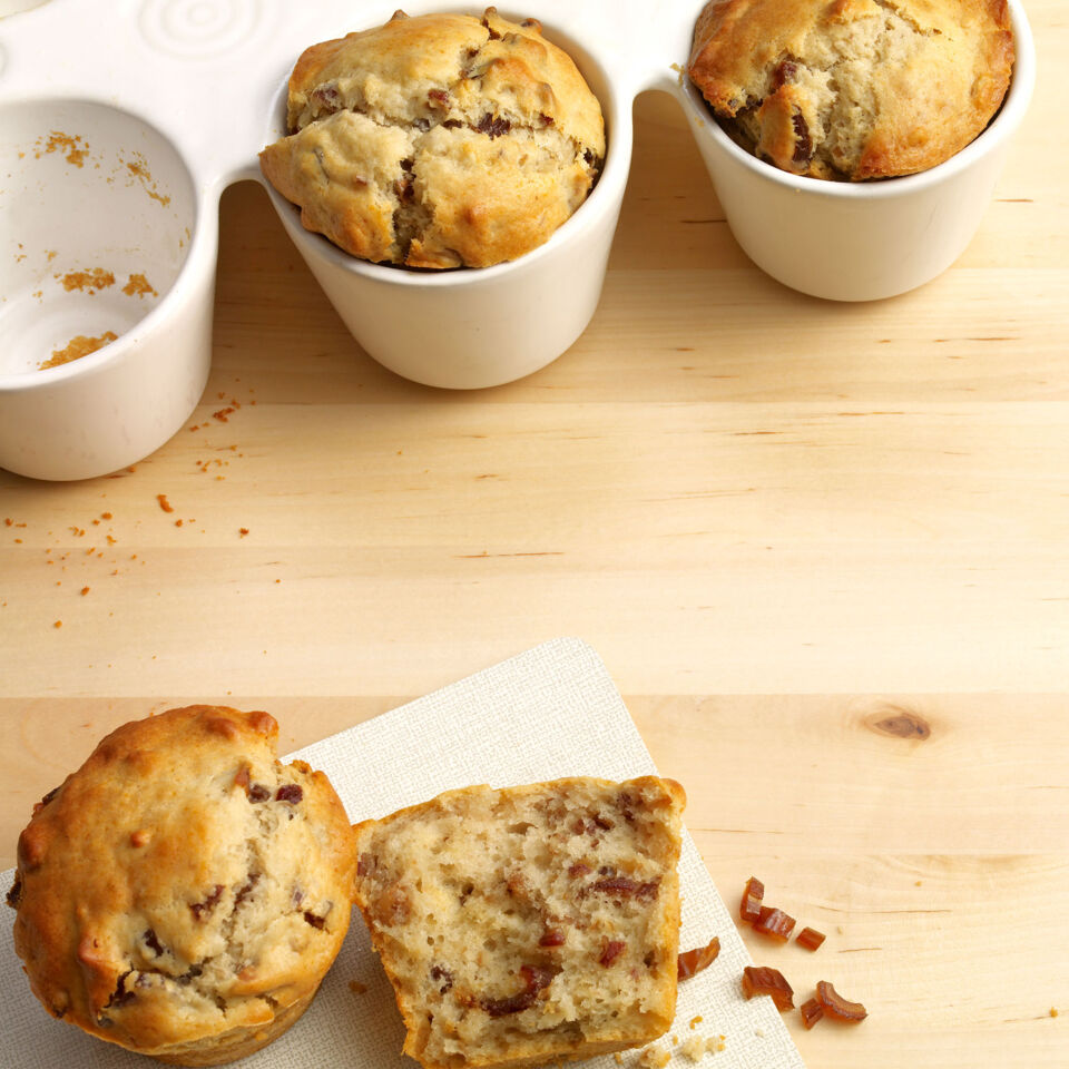 Den Backofen auf 180° (Umluft 160°) vorheizen. Die Muffinmulden fetten und die Form kalt stellen. Mehl und Backpulver in einer Schüssel mischen. Die Datteln entsteinen, in kleine Stücke schneiden und unter die Mehlmischung heben. Die Walnüsse grob hacken.