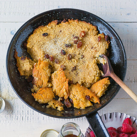 Hier werden Grießbrei und Kaiserschmarrn zu einem ganz neuen Dessert kombiniert: Grießschmarrn. Dazu gibt es frische Himbeeren.