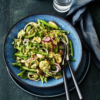 Essig, Öl, Senf und Dill in einer großen Salatschüssel vermischen. Mit Kräutersalz abschmecken.