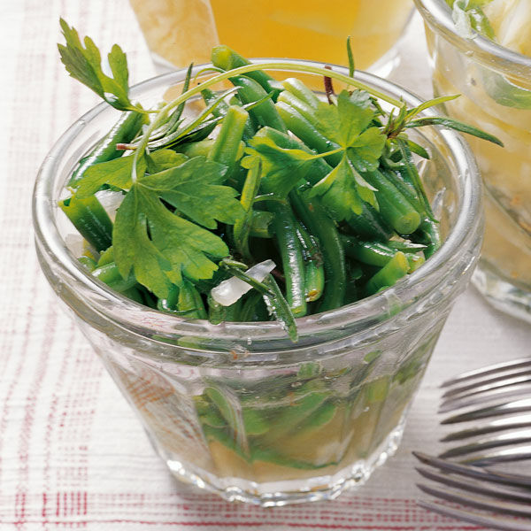 - Grüne Bohnen haben einen kräftigen Geschmack, der am besten zur Geltung kommt, wenn man den Bohnensalat nur mit Essig, Öl und ein paar Zwiebeln verfeinert. Davon können sie aber reichlich vertragen.