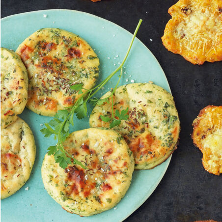 Ofen auf 220° (Umluft 200°) vorheizen. Ein Blech einfetten, mit Mehl bestreuen. Teig auf einer bemehlten Arbeitsfläche ca. 5 mm dick ausrollen, 8 Kreise (à ca. 10 cm Ø) ausstechen und auf das Blech legen. Kümmel im Mörser zerstoßen. Eigelb leicht verquirlen und die Laiberl damit bepinseln. Mit Kümmel und Meersalz bestreuen. Im Backofen (Mitte) 20-25 Min. backen.