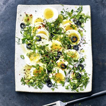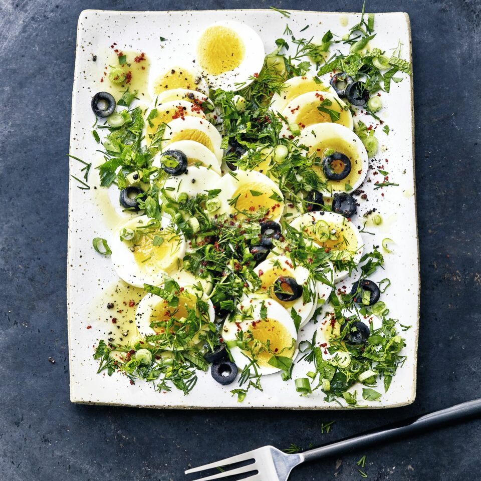 Die Eier dachziegelartig überlappend auf einer Platte auslegen und mit der Kräuter-Frühlingszwiebel-Mischung und den Oliven bestreuen. Die Eier mit Dressing beträufeln und mit Pul biber bestreut servieren.