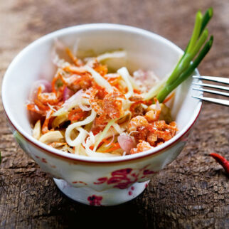 Die Schalotten schälen und in feine Streifen schneiden. In einer Schüssel Palmzucker, Fischsauce und die Garnelenpaste vermischen. Die Mischung im Wok bei kleiner Hitze aufkochen und so lange rühren, bis der Zucker geschmolzen ist. Dann die getrockneten Garnelen, die Schalotten und die Chiliflocken dazugeben und bei kleiner Hitze unter ständigem Rühren ca. 2 Min. weiterköcheln lassen. Die Mischung in ein Schälchen umfüllen.