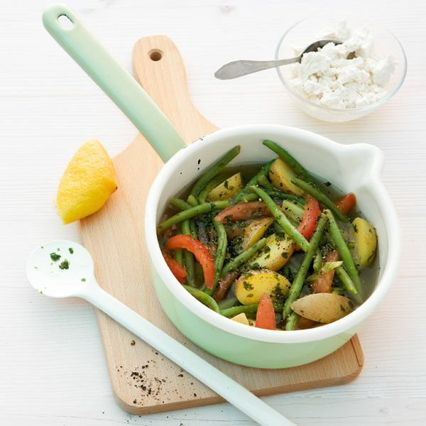 Deutsche Hausmannskost aus Bohnen, Kartoffeln und Tomaten, kombiniert mit würzigem Schafskäse.