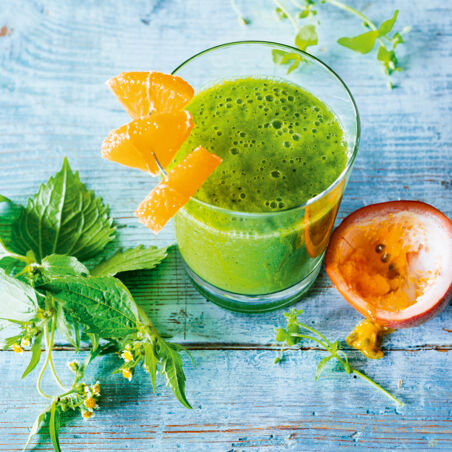 Grüner Kräuter-Smoothie mit Orange und Maracuja