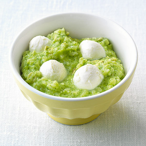 Dieser Reisbrei für Kleinkinder sorgt für Abwechslung beim Mittagessen. Ein Zucchino und Pesto aus dem Glas verleihen ihm seine schöne Farbe.