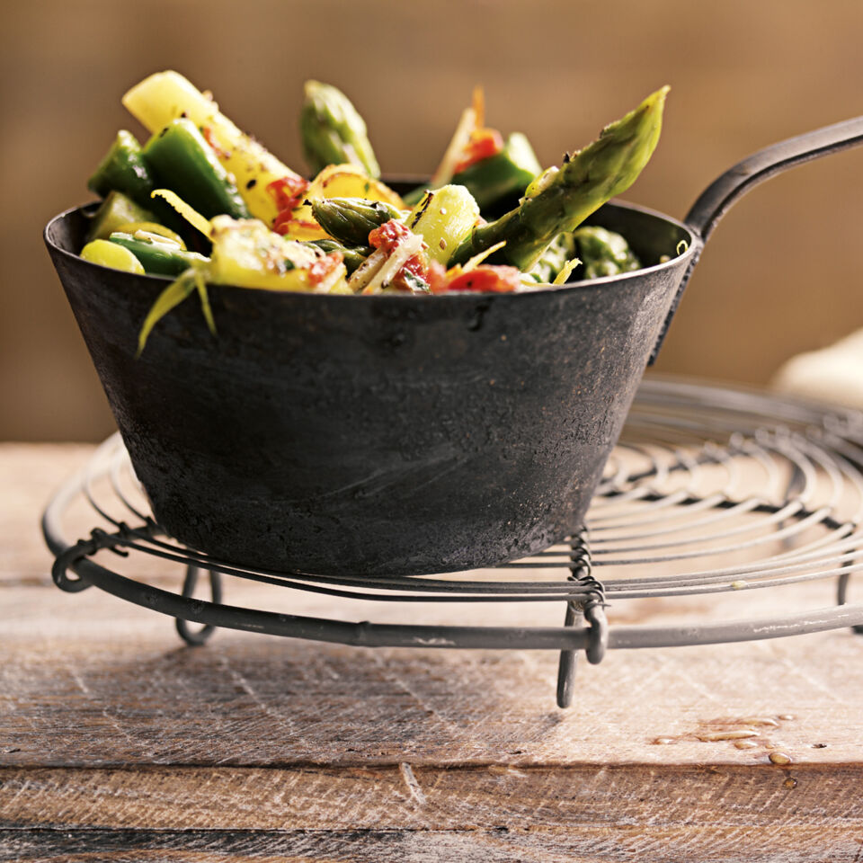 Die Spargelstangen waschen und die Enden abschneiden, falls nötig, die unteren Enden der Spargelstangen dünn schälen. Stangen dritteln oder halbieren. Für den Spargel in einem Topf Wasser zum Kochen bringen und salzen. Spargel darin in etwa 6 Min. bissfest garen.