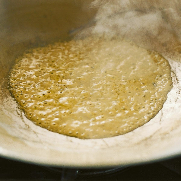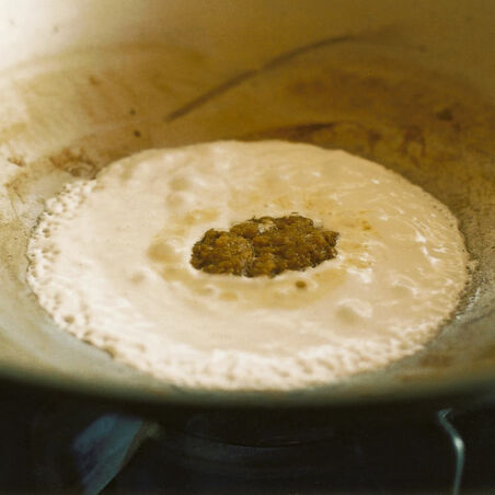 Von der dicken, festen Kokossahne, die sich in der ungeschüttelten Kokosmilchdose oben absetzt, 4-5 EL abnehmen und in den Wok (oder in eine hochwandige Pfanne) geben. Bei mittlerer Hitze erwärmen, bis sie sprudelnd kocht. Die Currypaste hinzufügen und sorgfältig unterrühren. Die Mischung bei mittlerer Hitze ca. 2 Min. ohne Umrühren braten, bis sich an der Oberfläche kleine Löchlein bilden, aus denen Öl austritt. Vom Rand her ca. 3 EL Kokosmilch angießen und sorgfältig unterrühren. 1 Min. weiterbraten, bis eine homogene, cremige Masse entsteht.