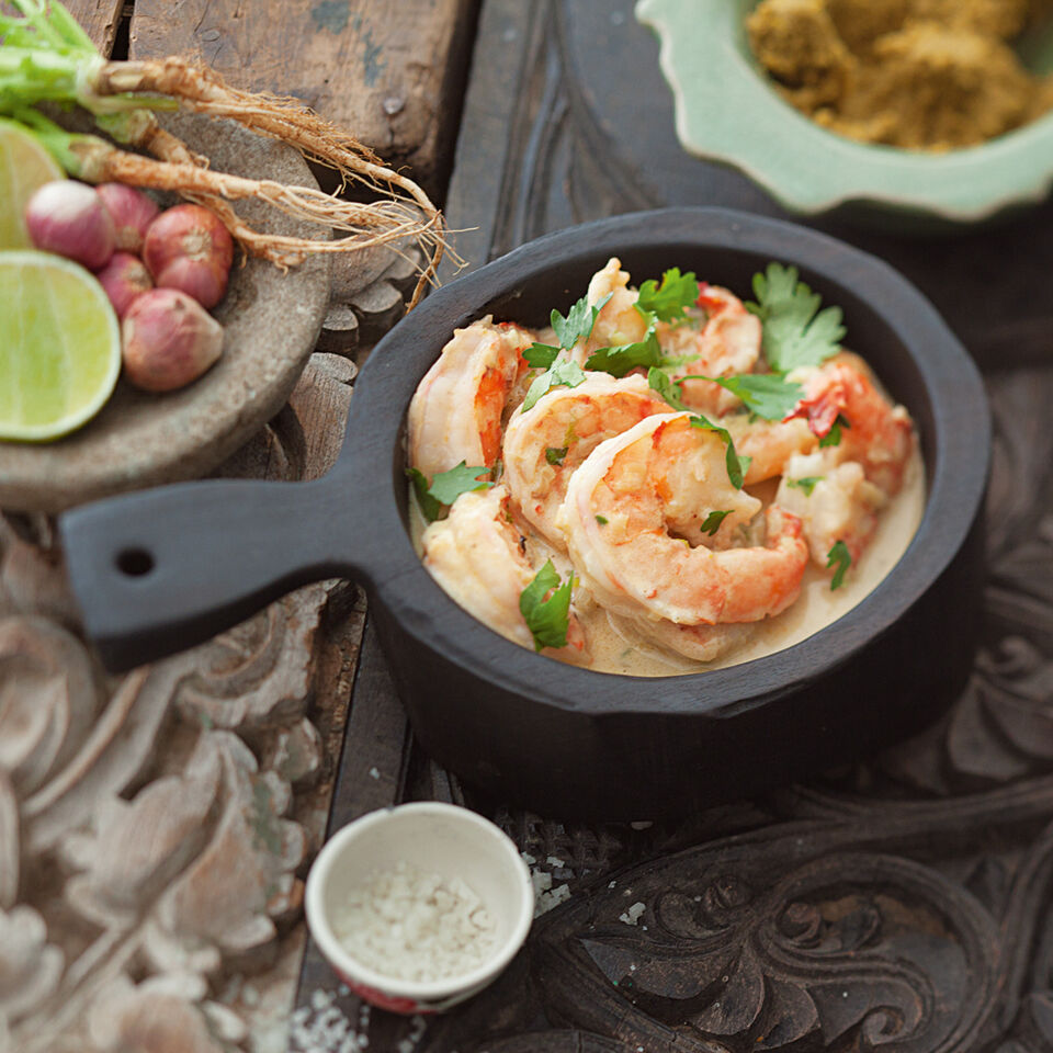 Die Garnelen waschen und trocken tupfen. Im Curry in 4 - 5 Min. gar ziehen lassen, dann alles mit Korianderblättern und Duftreis servieren.