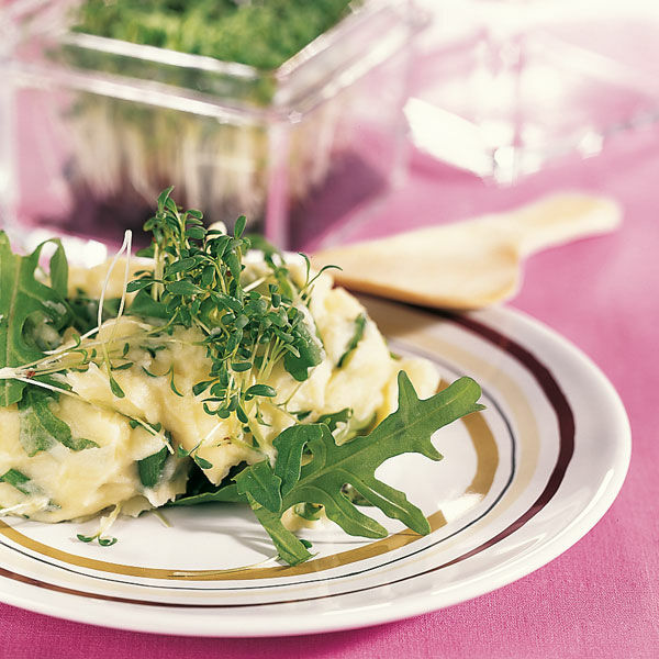 Die Kartoffeln abgießen und im Topf mit dem Kartoffelstampfer gut zerdrücken. Die Milch einrühren, nur kurz rühren. Das Püree mit Salz und Pfeffer würzen, Rucola und Kresse untermischen und nur zusammenfallen lassen. Probieren und eventuell nachwürzen, dann auf den Tisch mit dem Brei.