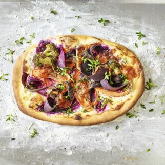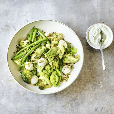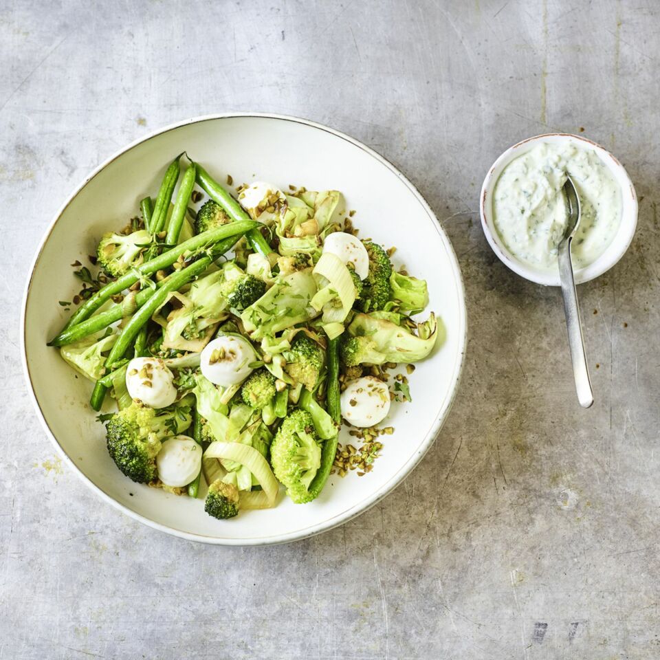Inzwischen Joghurt mit Kräutern (bis auf 2 TL) verrühren, salzen und pfeffern. Pistazien hacken, mit den 2 TL Kräutern mischen. Mozzarella abtropfen, in den Pistazien wenden, auf dem Gemüse verteilen. Alles ca. 2 Min. fertig garen. Mit dem Joghurt servieren.