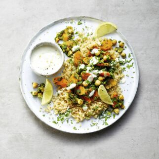 Den Grünkern in eine Servierschüssel geben. Ofengemüse, Grünkohl und Pflaumen dazugeben und alles gut vermengen. Mit Salz und Pfeffer abschmecken und direkt vor dem Servieren mit dem übrigen Olivenöl (1 EL) beträufeln.