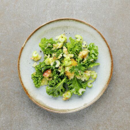 Den Staudensellerie waschen, entfädeln und in dünne Scheiben hobeln. Den Apfel waschen, abtrocknen, raspeln und zusammen mit dem Staudensellerie zum Grünkohl geben. Mit Salz und Pfeffer würzen.