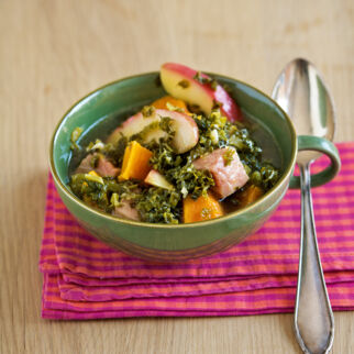 Der deftige Grünkohleintopf hält genau das, was er verspricht: Er macht satt, zufrieden und wärmt so wunderbar von innen. Für Gäste und die Familie!