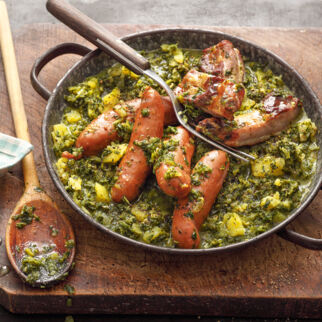 Wenn's draußen kalt ist, ist diese Suppe genau das Richtige: deftiger Grünkohl mit Fleischklößchen. Für süße Raffinesse sorgt Apfelmus. Unbedingt probieren!