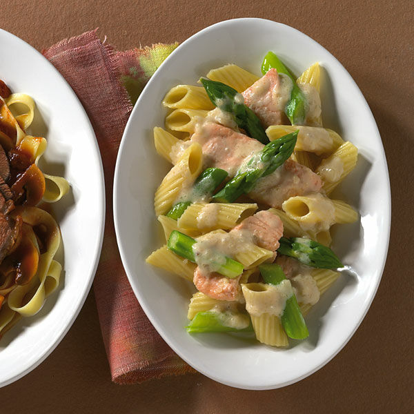 Die Stärkemischung in die Sauce geben und aufkochen lassen. Den Lachs und den Spargel in die Sauce geben. Ca. 2 Min. ziehen lassen, mit Salz und Pfeffer abschmecken. Schmale feine Bandnudeln oder Penne sind ideal dazu.