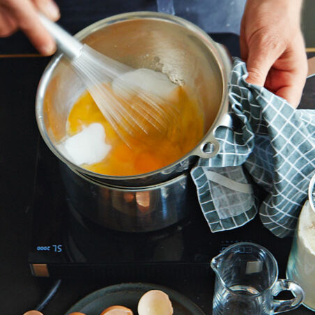 Für einen hellen Biskuit die Eier, den Zucker und 25 ml Wasser in einer Metallschüssel über einem heißen Wasserbad mit dem Schneebesen vermischen. Die Masse unter leichtem Rühren auf 35° (lauwarm) erwärmen, dann in eine Rührschüssel füllen.