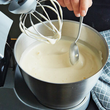 Die Eier-Zucker-Masse mit den Quirlen des Handrührgeräts oder der Küchenmaschine in 10-12 Min. hellschaumig schlagen. Der Eierschaum ist perfekt, wenn man einen Löffel durch die Masse zieht und die Spur eine Zeit lang sichtbar bleibt.