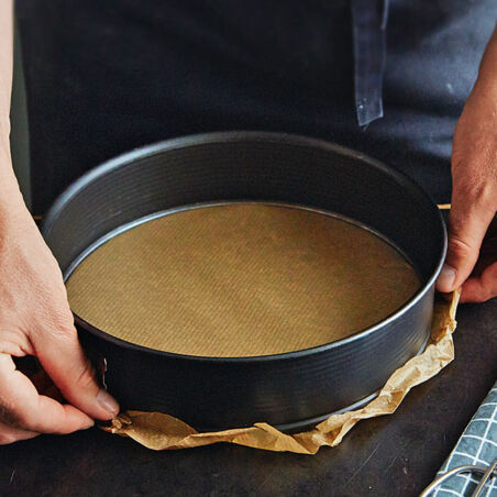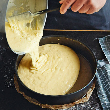 Den Springformboden mit Backpapier oder Pergamentpapier belegen. Den Backofen auf 190° vorheizen.