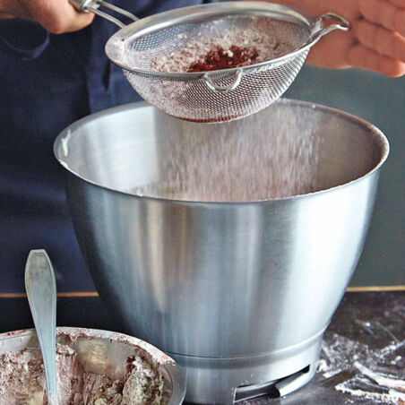 Für einen dunklen Biskuit ebenfalls Eier, Zucker und 25 ml Wasser über einem heißen Wasserbad hellschaumig schlagen. Mehl, Speisestärke und Kakaopulver (am besten schwach entölt) mischen und in eine Schüssel sieben.