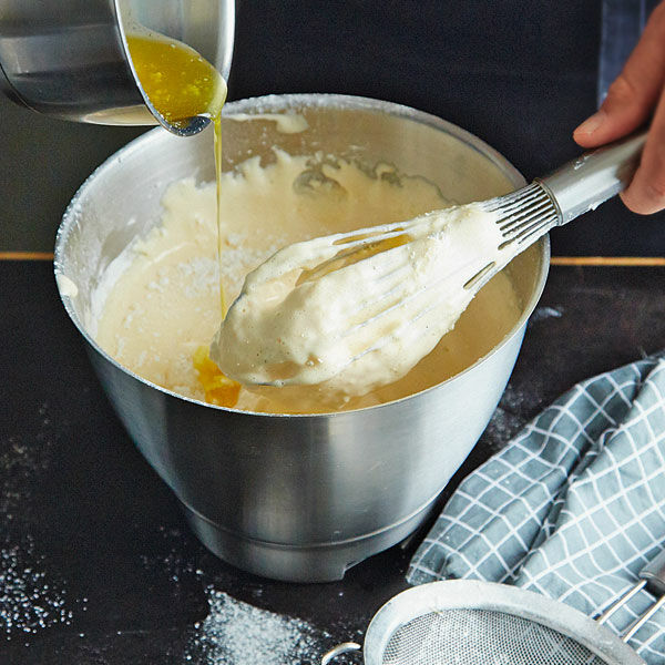 Das Mehl und die Speisestärke mischen und in eine Schüssel sieben. Die Mehlmischung mit dem Schneebesen portionsweise unter die Schaummasse heben. Mit dem letzten Drittel Mehlmischung die Butter einlaufen lassen und unterheben.