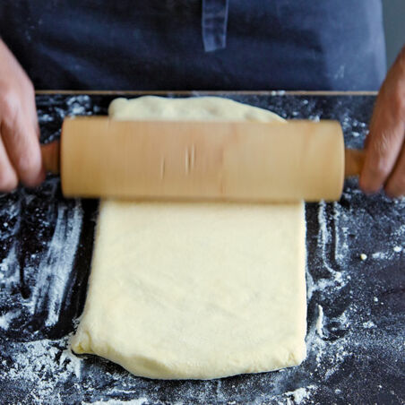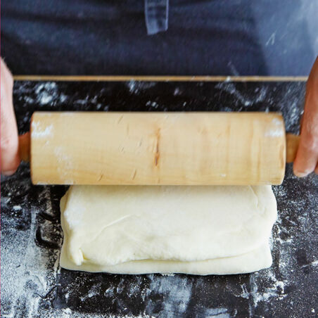 Das Teigpaket mit dem Nudelholz auf der mit Mehl bestäubten Arbeitsfläche zu einem ca. 1 cm dicken, schmalen Rechteck ausrollen. Wichtig ist dabei, dass nur in eine Richtung gerollt wird, also nur nach oben und unten, nicht aber nach rechts und links.