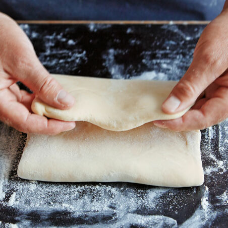 Den Teig auf einer Schmalseite anheben und ein Drittel über die Mitte einklappen. Die gegenüberliegende Schmalseite über den eingeschlagenen Teig legen, sodass drei Schichten entstehen.