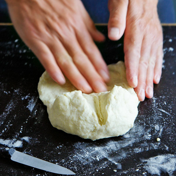 Den Teig auf der mit Mehl bestäubten Arbeitsfläche zu einer Kugel formen, kreuzweise 1 cm tief einschneiden und zu einem Quadrat von ca. 20 x 20 cm flach drücken. In Frischhaltefolie gewickelt ca. 1 Std. im Tiefkühlgerät durchkühlen (nicht gefrieren!) lassen.