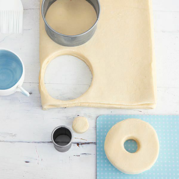 Aus dem Teigstapel mit dem großen Ausstecher 6 Kreise ausstechen. Danach mit dem kleinen Ausstecher bei jedem Kreis ein Loch aus der Mitte stechen.