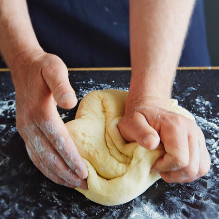 Den Teig mit den Händen auf der mit Mehl bestäubten Arbeitsfläche kräftig durchkneten und zu beliebigem Gebäck weiterverarbeiten.