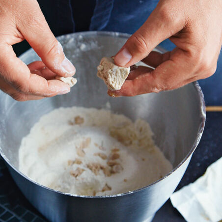 Das Mehl in eine Rührschüssel sieben und die Hefe dazubröckeln oder im Ganzen hinzufügen (sie ist ziemlich weich und löst sich beim Kneten auch von selbst auf).