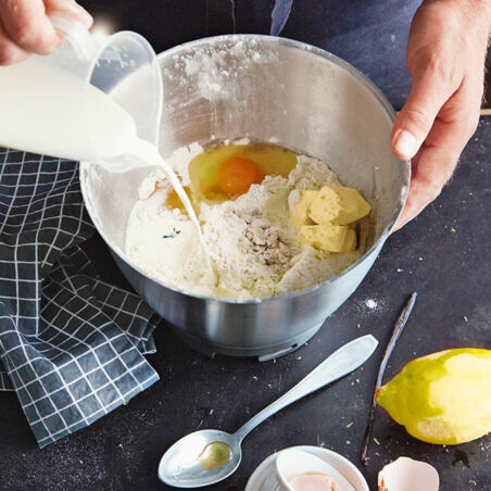 Die angegebenen Zutaten in eine Schüssel geben. Milch, Ei und Hefe können Sie kühlschrankkalt dazugeben, denn durch das spätere ausgiebige Kneten erwärmt sich der Teig. Lediglich die Butter sollte weich sein, damit sie sich gut mit den anderen Zutaten verbinden kann.
