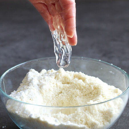 Puderzucker und Glukosesirup zur Mandelmasse geben und alles mit der Hand oder in der Küchenmaschine so lange kneten, bis die Masse homogen ist, aber nicht ölig wird.