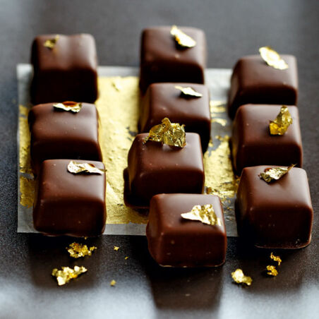 Zum Überziehen die Vollmilchkuvertüre hacken, schmelzen und temperieren. Jede Praline mit der Pralinengabel in die Kuvertüre tauchen, die Kuvertüre ablaufen lassen, die Praline am Schüsselrand abstreifen und auf Backpapier setzen. Nach Belieben die Pralinen – solange die Kuvertüre noch weich ist – mit je einem Stückchen Blattgold garnieren und fest werden lassen.
