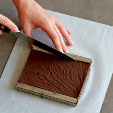 Die Pralinenmasse vorsichtig am Rand des Rahmens entlang einschneiden und den Rahmen entfernen. Die Ganache in 35 Quadrate schneiden.