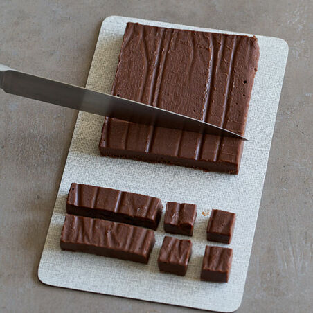 Zum Schneiden der Ganache einen hohen Rührbecher mit heißem Wasser und ein sauberes Geschirrtuch oder Küchenpapier bereitlegen. Beim Schneiden immer wieder zwischendurch das Messer in das heiße Wasser eintauchen und trocken reiben. So lässt sich die Ganache schneiden, ohne am Messer anzuhaften.