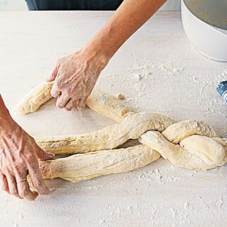 Alles zuerst mit den Knethaken des Handrührgeräts, dann mit den Händen verkneten, bis ein glatter und seidig glänzender Teig entstanden ist.