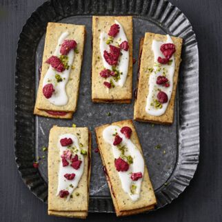 Inzwischen für das Frosting Frischkäse, Puderzucker, Zitronensaft und Vanille verrühren. Die Creme auf den Kuchen streichen. Die Pistazien fein hacken und auf das Frosting streuen. Den Kuchen gekühlt servieren.