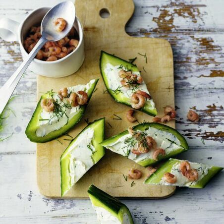 Die gefüllten Gurkenhälften schräg in 4 cm breite Stücke schneiden. Jedes Stück mit einigen Krabben belegen, mit dem restlichen Dill bestreuen und von der Hand in den Mund genießen.