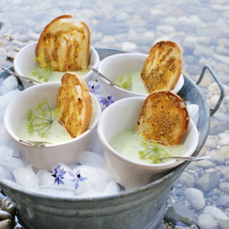 Den Dill abbrausen und trocken schütteln, die Dillspitzen abzupfen und hacken. Die Limettenhälfte waschen und abtrocknen, die Schale abreiben und den Saft auspressen. Limettensaft und Dill unter die Suppe rühren. Die Suppe mit Salz, Cayennepfeffer und Limettenschale würzen. Bis zum Servieren in den Kühlschrank stellen.