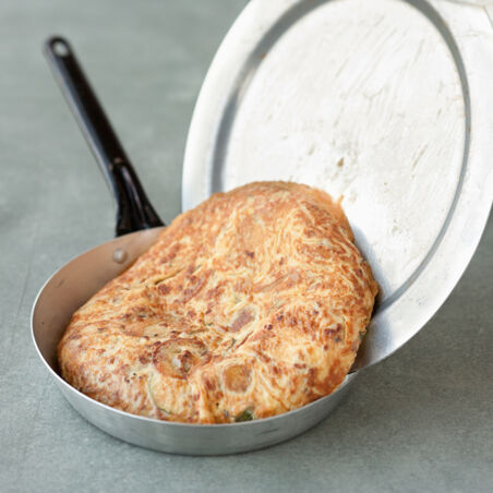 Die Eiersahne gleichmäßig über die Kartoffelmischung gießen und zugedeckt bei schwacher Hitze 20-25 Min. stocken lassen. Dabei die Pfanne ab und zu rütteln, damit die Tortilla nicht am Boden ansetzt. Wenn die Eiersahne gestockt ist, einen flachen Topfdeckel oder einen Pizzateller auf die Pfanne legen. Die Pfanne mit Teller (festhalten!) umdrehen und die Tortilla mit der gebratenen Seite nach oben wieder in die Pfanne gleiten lassen. Bei schwacher Hitze zugedeckt ca. 10 Min. weiterbraten. Die Tortilla kurz ruhen lassen und auf eine Platte stürzen. Zum Servieren wie eine Torte in Stücke schneiden.