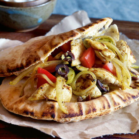 Das restliche Öl in Pfanne oder Wok erhitzen, die Zwiebeln darin bei mittlerer Hitze 3-4 Min. garen. Das Fleisch wieder dazugeben, alles mit Zitronensaft und -schale würzen und die Flüssigkeit rasch bei starker Hitze verkochen lassen. Jeweils eine tiefe Tasche in die Pitabrote schneiden, evtl. kurz auf dem Toaster anwärmen. Brote mit Gurkenjoghurt, Tomatenwürfeln, Olivenscheiben und Fleisch füllen und sofort servieren.