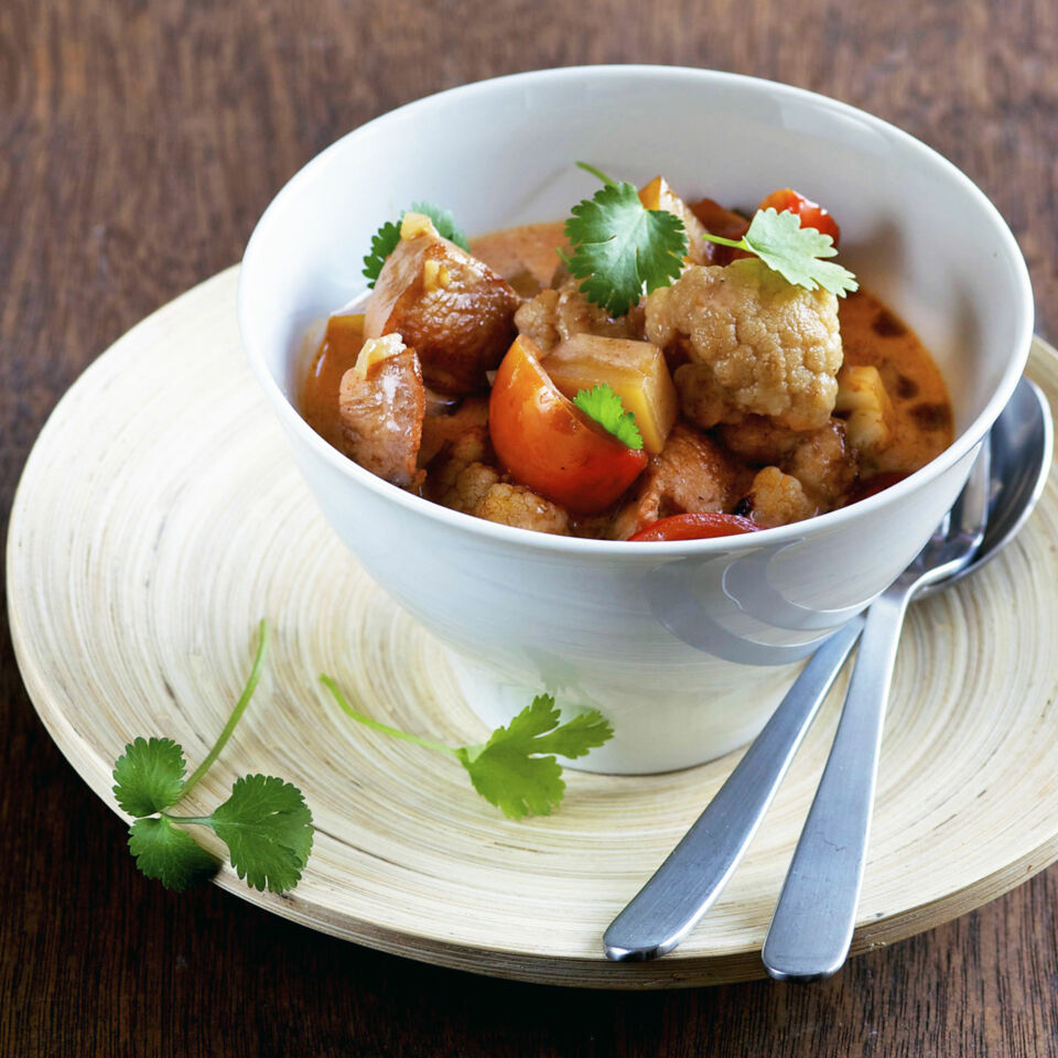 Dieses Thai-Curry mit Süßkartoffeln, Blumenkohl und Tomaten wird Ihren Kindern schmecken.