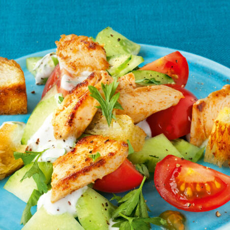 Saftige Hähnchenbrust und krosse Ciabattacroûtons kombiniert mit frischem Gemüse. Eine knackig frische Alternative zu Döner und Co. Fertig in 30 Minuten.